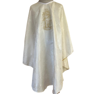 Casulla blanca sencilla de raso, bordado a máquina de San José y el Niño, en la espalda bordado a máquina de la Cruz. Incluye estola.
