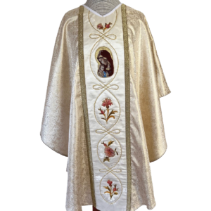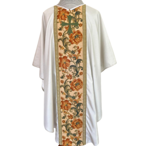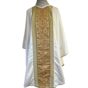 Casulla blanca bordada a máquina con aplicación de galones dorados (incluye estola).