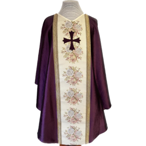 Casulla de raso morada, bordada a mano. Incluye estola, carpeta y velo de cáliz.