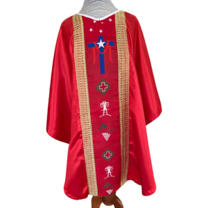 Casulla de raso con motivos chilenos con aplicación de galones dorados (incluye estola).