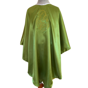 Casulla verde sencilla de raso, con bordado a máquina de la Virgen y el Niño, atrás bordado de la Cruz.